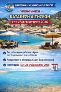 Το Ν.Π.Δ.Δ. Δημοτικό Λιμενικό Ταμείο Πάργας προκειμένου να αποφύγει τυχόν καθυστερήσεις και θέλοντας ταυτόχρονα να προστατέψει την ομαλή λειτουργία της Χερσαίας Ζώνης Λιμένα εν όψη της επερχόμενης τουριστικής περιόδου υπενθυμίζει την υποχρέωση των ενδιαφερόμενων δικαιούχων στην κατάθεση σχετικής αίτησης συνοδευόμενης από τα απαραίτητα δικαιολογητικά εντός τις γνωστοποιημένης ημερομηνίας ήτοι 28 Φεβρουαρίου 2026 . Σε περίπτωση που δεν έχει γίνει κατάθεση σχετικής αίτησης συνοδευόμενης από τα απαραίτητα δικαιολογητικά θα υπάρξει ζήτημα ως προς τις άδειες παραχώρησης χώρων.