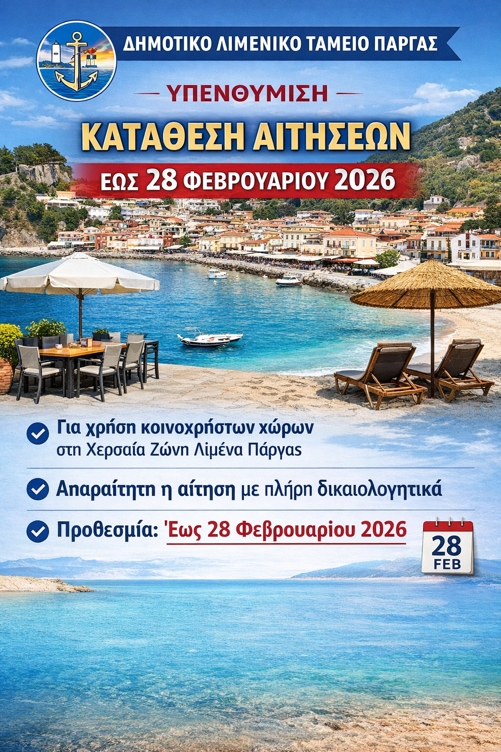 Το Ν.Π.Δ.Δ. Δημοτικό Λιμενικό Ταμείο Πάργας προκειμένου να αποφύγει τυχόν καθυστερήσεις και θέλοντας ταυτόχρονα να προστατέψει την ομαλή λειτουργία της Χερσαίας Ζώνης Λιμένα εν όψη της επερχόμενης τουριστικής περιόδου υπενθυμίζει την υποχρέωση των ενδιαφερόμενων δικαιούχων στην κατάθεση σχετικής αίτησης συνοδευόμενης από τα απαραίτητα δικαιολογητικά εντός τις γνωστοποιημένης ημερομηνίας ήτοι 28 Φεβρουαρίου 2026 . Σε περίπτωση που δεν έχει γίνει κατάθεση σχετικής αίτησης συνοδευόμενης από τα απαραίτητα δικαιολογητικά θα υπάρξει ζήτημα ως προς τις άδειες παραχώρησης χώρων.