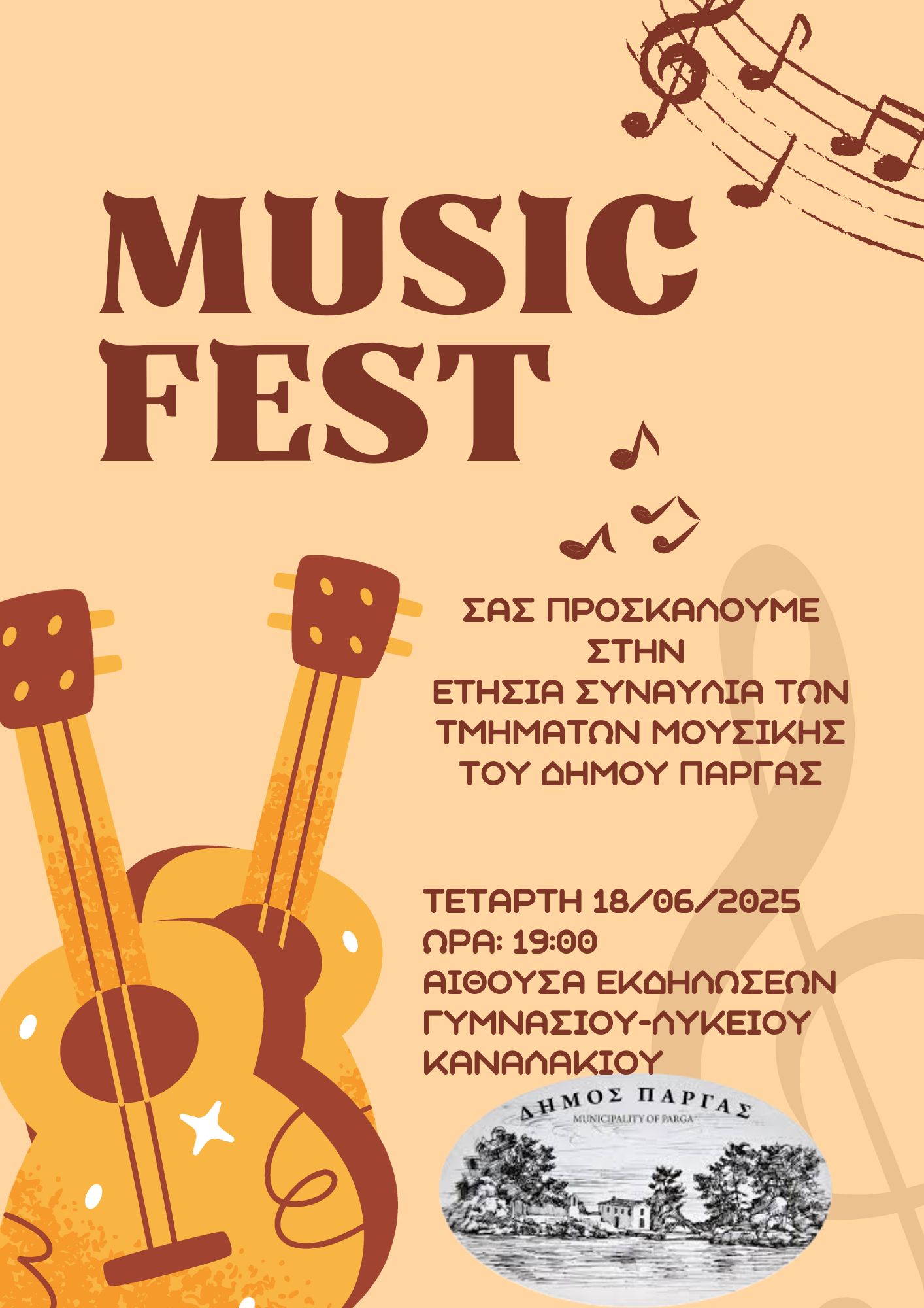 Ο Δήμος Πάργας, σας προσκαλεί στην Ετήσια Εκδήλωση των Μουσικών Τμημάτων του, η οποία θα πραγματοποιηθεί την Τετάρτη 18 Ιουνίου 2025 και ώρα 19:00, στην Αίθουσα Εκδηλώσεων του Γυμνασίου - Λυκείου Καναλλακίου.