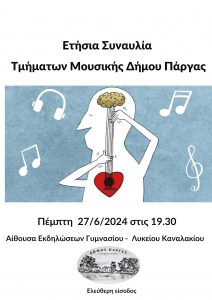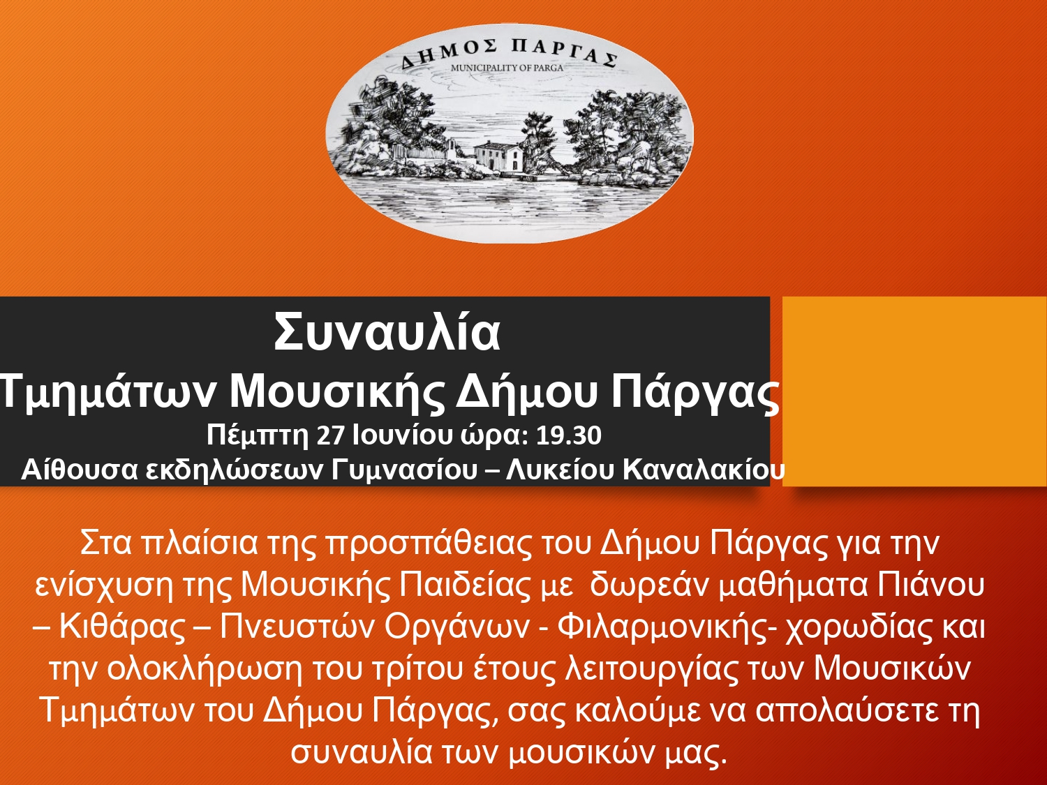 Ο Δήμος Πάργας στα πλαίσια της προσπάθειας για την ενίσχυση της Μουσικής Παιδείας με δωρεάν μαθήματα Πιάνου-Κιθάρας-Πνευστών Οργάνων-Φιλαρμονικής- Χορωδίας και την ολοκλήρωση του τρίτου έτους λειτουργίας των Μουσικών Τμημάτων του Δήμου Πάργας, σας καλούμε να απολαύσετε τη συναυλία των μουσικών μας, ημέρα Πέμπτη 27 Ιουνίου και ώρα 19:30 στην Αίθουσα εκδηλώσεων Γυμνασίου- Λυκείου Καναλακίου.