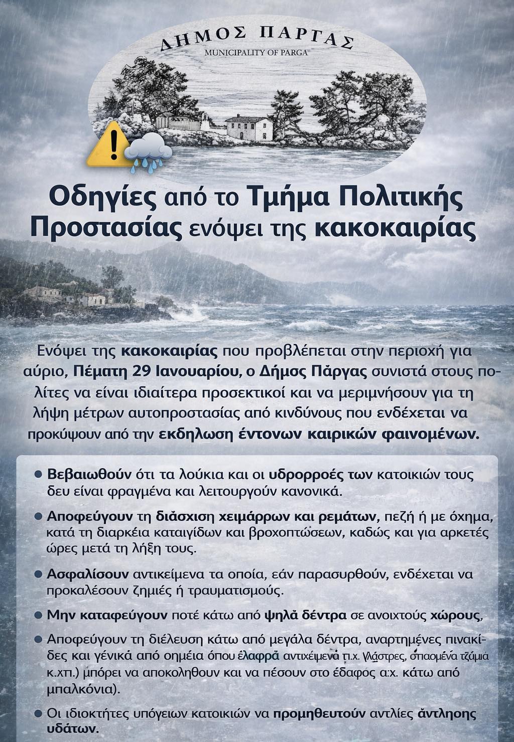 Ενόψει της κακοκαιρίας που προβλέπεται στην περιοχή για αύριο, Πέμπτη 29 Ιανουαρίου, ο Δήμος Πάργας συνιστά στους πολίτες να είναι ιδιαίτερα προσεκτικοί και να μεριμνήσουν για τη λήψη μέτρων αυτοπροστασίας από κινδύνους που ενδέχεται να προκύψουν από την εκδήλωση έντονων καιρικών φαινομένων.