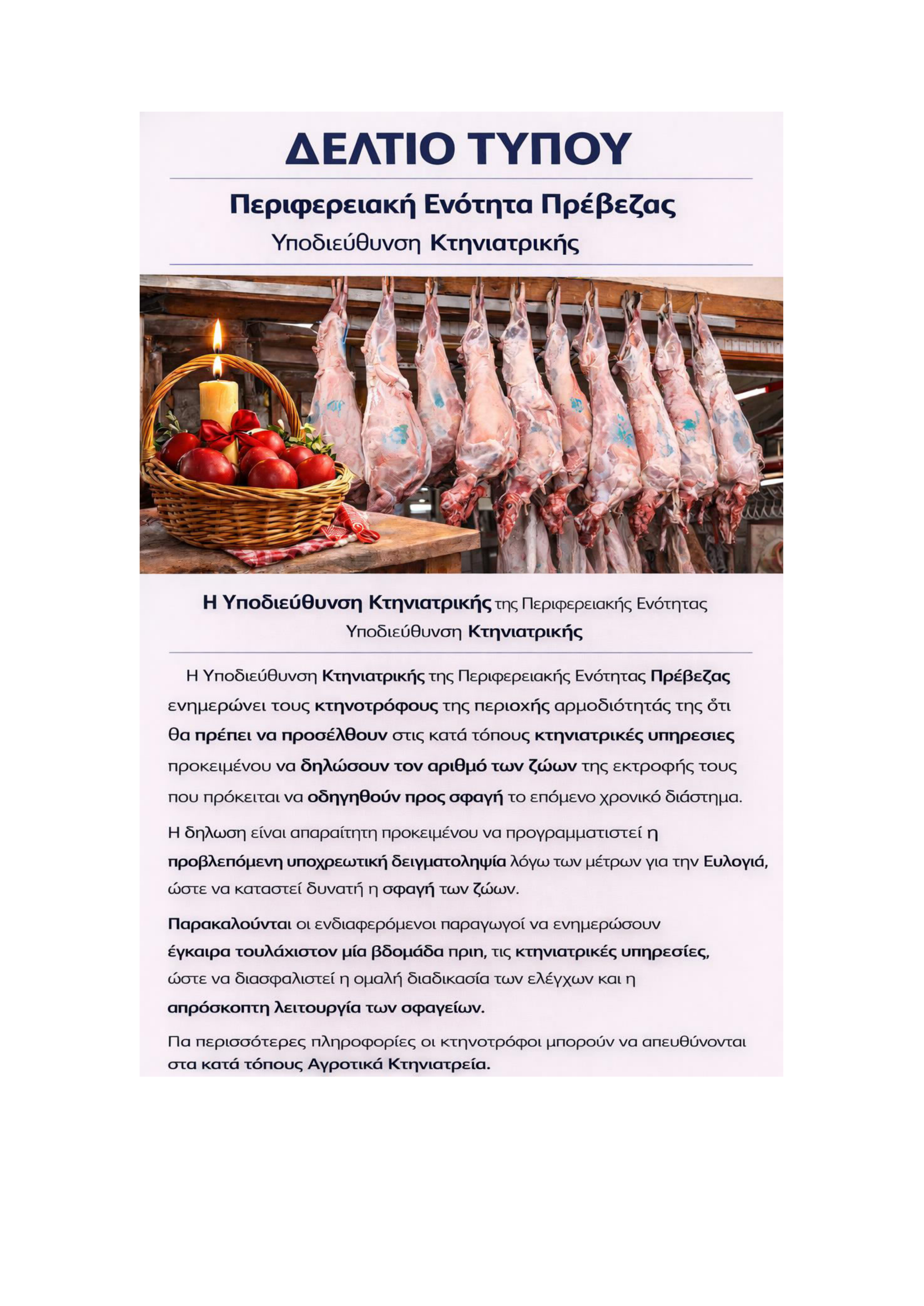 Η Υποδιεύθυνση Κτηνιατρικής της Περιφερειακής Ενότητας Πρέβεζας ενημερώνει τους κτηνοτρόφους της περιοχής αρμοδιότητάς της ότι θα πρέπει να προσέλθουν στις κατά τόπους κτηνιατρικές υπηρεσίες προκειμένου να δηλώσουν τον αριθμό των ζώων της εκτροφής τους που πρόκειται να οδηγηθούν προς σφαγή το επόμενο χρονικό διάστημα.