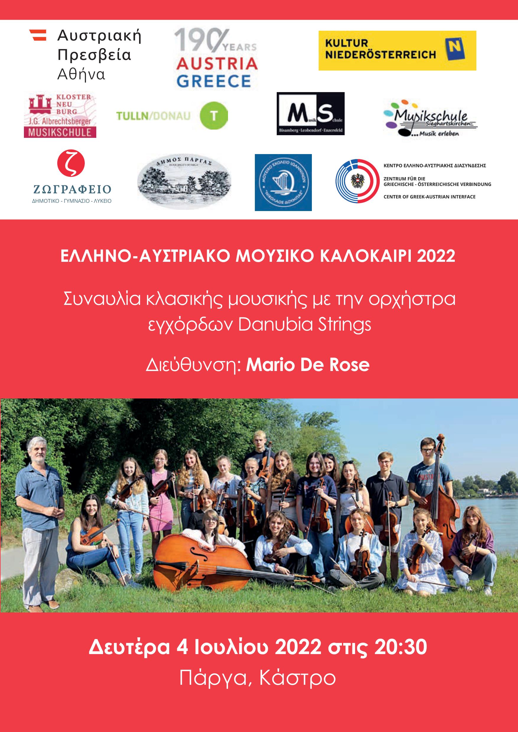 Ο Δήμος Πάργας σε συνεργασία με την Πρεσβεία της Αυστρίας στην Αθήνα ,το Ζωγράφειο Σχολείο, το κέντρο Ελληνο-Αυστριακής Διασύνδεσης και το Μουσικό Σχολείο Ιωαννίνων «Νικόλαος Δούμπας», διοργανώνουν συναυλία κλασικής μουσικής με την ορχήστρα εγχόρδων Danubia Strings της παραδουνάβιας περιοχής της Κάτω Αυστρίας, στο Κάστρο της Πάργας την Δευτέρα 4 Ιουλίου στις 20.30 με ελεύθερη είσοδο.